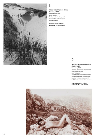 82W I L H E L M V O N G L O E D E N ( 1 8 5 6 %u2013 1 9 3 1 ) Taormina, 1912Vintage silver print, sepia tonedRare exhibtion print26,4 %u00d7 37,2 cmSigned, titled and dated with ink in the image lower right, photographer%u2019s stamp and several notations in pencil on the reverseStarting price: %u20ac 2.600Estimate: %u20ac 3.500%u20134.0001PA U L W O L F F ( 1 8 8 7 %u2013 1 9 5 1 ) Nordsee, c.1935Vintage silver print23,4 %u00d7 16,6 cmPhotographer%u2019s stamp with handwritten order number on the reverseStarting price: %u20ac 800*Estimate: %u20ac 1.200%u20131.600