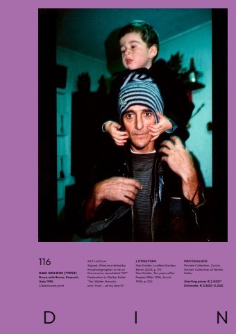 116N A N G O L D I N ( * 1 9 5 3 ) Bruce with Bruno, Pozzuoli, Italy 1995Cibachrome print49,7 %u00d7 40,1 cmSigned, titled and dated by the photographer in ink on the reverse, annotated %u201cGP%u201dDedication to Walter Keller %u201cFor Walter the only one I trust %u2026 all my love N.%u201dLITERATURENan Goldin, Luzifers Garten, Berlin 2003, p. 110Nan Goldin, Ten years after Naples 1986%u20131996, Zurich 1998, p. 100PROV E N AN C E Private Collection, Zurich, former Collection of Walter KellerStarting price: %u20ac 2.000*Estimate: %u20ac 2.800%u20133.200DIN