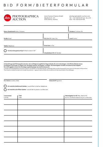 Ich m%u00f6chte telefonisch bieten I would like to bid by telephoneIch m%u00f6chte schriftlich bieten I would like to place a written bidOrt, Datum Location, DateNur f%u00fcr schriftliche Gebote Only for written bidsUnterschrift SignatureIch beauftrage Leitz Photographica Auction, bei nachfolgend angef%u00fchrten Gegenst%u00e4nden f%u00fcr mich mitzusteigern. Schriftliche Gebote m%u00fcssenbis l%u00e4ngstens 24 Stunden vor Beginn der Versteigerung beim Versteigerer vorliegen. Das H%u00f6chstgebot versteht sich exklusive des Aufgelds.Der Auftraggeber erkennt die Versteigerungsbedingungen des Auktionshauses an.I accept Leitz Photographica Auction to bid on my behalf on the following lots. Absentee bids must be received 24 hours prior to the start of the auction.The maximum bid price does not include the premium. I agree to be bound by the conditions of sale as printed in the catalogue.Leica Camera Classics GmbH Westbahnstr. 401070 Vienna, Austriaphotographs@leitz-auction.comTel.: +43 1 523 56 59 ext. 16 or 53Fax: +43 1 523 56 59 88Name, Gesellschaft Name, Company Stra%u00dfe StreetTelefon Telephone Umsatzsteuer-ID VAT NumberKundennr Customer No.PLZ, Ort ZIP-Code, City Land CountryEmail oder or FaxBID FORM/BIETERFORMULARVorsteuerabzugsberechtigt Entitled to deduct VATLosnummerLot No.TitelTitleH%u00f6chstgebot (in %u20ac) Max. Bid (in %u20ac)