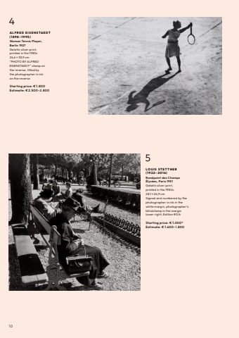 104A L F R E D E I S E N S TA E D T (1898%u20131995)Woman Tennis Player, Berlin 1927Gelatin silver print, printed in the 1980s24,6 %u00d7 33,9 cm%u201cPHOTO BY ALFREDEISENSTAEDT%u201d stamp on the reverse, titled by the photographer in ink on the reverseStarting price: %u20ac 1.800Estimate: %u20ac 2.500%u20132.8005LOUIS STETTNER( 1 9 2 2 %u2013 2 0 1 6 ) Rondpoint des Champs %u00c8lys%u00e9es, Paris 1951Gelatin silver print, printed in the 1980s28,1 %u00d7 26,9 cmSigned and numbered by the photographer in ink in the white margin, photographer%u2019s blindstamp in the margin lower right; Edition #3/6Starting price: %u20ac 1.000*Estimate: %u20ac 1.600%u20131.800
