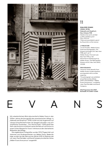 11WA L K E R E VA N S ( 1 9 0 3 %u2013 1 9 7 5 ) Sidewalk and Shopfront, New Orleans 1935Gelatin silver print, printed in 1973, exhibtion print33,4 %u00d7 26,4 cmTitled and annotated in pencil by the printer on the reverseLITERATURELincoln Kirstein, Walker Evans: American Photographs, The Museum of Modern Art, New York 1938, part I, pl. 5Walker Evans, First and Last, New York 1978, p. 122Maria Morris Hambourg et al., Walker Evans, The Metropolitan Museum of Art, New York 2000, COVERPROV E N AN C E The print comes directly from Walker Evans%u2019s studio assistant, accompanied with a written expertiseThis photograph was exhibitedat Les Rencontres d%u2019Arles 2015 in the exhibition %u201cWalker Evans Anonymous%u201d, curated by Jean-Paul Deridder and David Campany.Starting price: %u20ac 2.200*Estimate: %u20ac 3.000%u20134.000Mit unbestechlichem Blick dokumentierte Walker Evans in den 1930er-Jahren die Ikonografie des amerikanischen Alltags. In %u201eSidewalk and Shopfront%u201c (1935) richtet sich sein Augenmerk auf urbane Schaufensterfronten als Spiegel kultureller und wirtschaftlicher Dynamiken. %u201eTorn Movie Poster%u201c (1930) greift das Motiv des Konsums im Moment seines Zerfalls auf und wird so zu einem fr%u00fchen Beispiel f%u00fcr Evans%u2019 Interesse an den %u00fcbersehenen Bildwelten des Alltags. Die angebotenen Fotografien wurden 1972/73 geprintet und stammen vom Studioassistenten von Walker Evans. Beide Abz%u00fcge wurden bei den Rencontres d%u2019Arles 2015 im Rahmen der von Jean-Paul Deridder und David Campany kuratierten Schau %u201eWalker Evans Anonymous%u201c ausgestellt.EVANS