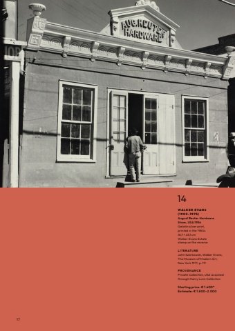1714WA L K E R E VA N S ( 1 9 0 3 %u2013 1 9 7 5 ) August Reuter Hardware Store, USA 1936Gelatin silver print, printed in the 1980s18,7 %u00d7 23,1 cmWalker Evans Estate stamp on the reverseLITERATUREJohn Szarkowski, Walker Evans, The Museum of Modern Art, New York 1971, p. 111PROV E N AN C E Private Collection, USA acquired through Harry Lunn CollectionStarting price: %u20ac 1.400*Estimate: %u20ac 1.800%u20132.000
