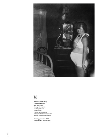 1916WEEGEE (1899%u20131968) Lucinda Pregnant, New York 1945Vintage silver print, black light tested31,9 %u00d7 26,7cmPhotographer%u2019s stamp (%u201cWeegee the Famous%u201d) on the reverse, titled on the reverseStarting price: %u20ac 4.000Estimate: %u20ac 5.000%u20136.000