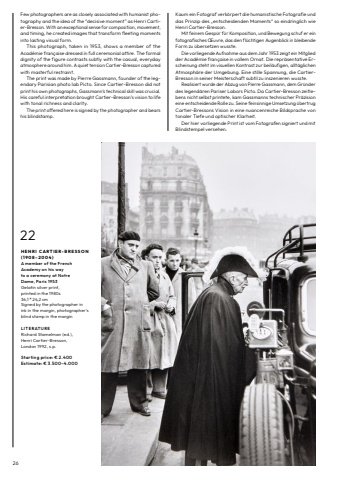 2622H E N R I C A R T I E R- B R E S S O N ( 1 9 0 8 %u2013 2 0 0 4 ) A member of the French Academy on his way to a ceremony at Notre Dame, Paris 1953Gelatin silver print, printed in the 1980s36,1 %u00d7 24,2 cmSigned by the photographer in ink in the margin, photographer%u2019s blind stamp in the marginLITERATURERichard Stamelman (ed.), Henri Cartier-Bresson, London 1992, s.p.Starting price: %u20ac 2.400Estimate: %u20ac 3.500%u20134.000Kaum ein Fotograf verk%u00f6rpert die humanistische Fotografie und das Prinzip des %u201eentscheidenden Moments%u201c so eindringlich wie Henri Cartier-Bresson.Mit feinem Gesp%u00fcr f%u00fcr Komposition, und Bewegung schuf er ein fotografisches %u0152uvre, das den fl%u00fcchtigen Augenblick in bleibende Form zu %u00fcbersetzen wusste.Die vorliegende Aufnahme aus dem Jahr 1953 zeigt ein Mitglied der Acad%u00e9mie fran%u00e7aise in vollem Ornat. Die repr%u00e4sentative Erscheinung steht im visuellen Kontrast zur beil%u00e4ufigen, allt%u00e4glichen Atmosph%u00e4re der Umgebung. Eine stille Spannung, die CartierBresson in seiner Meisterschaft subtil zu inszenieren wusste.Realisiert wurde der Abzug von Pierre Gassmann, dem Gr%u00fcnder des legend%u00e4ren Pariser Labors Picto. Da Cartier-Bresson zeitlebens nicht selbst printete, kam Gassmanns technischer Pr%u00e4zision eine entscheidende Rolle zu. Seine feinsinnige Umsetzung %u00fcbertrug Cartier-Bressons Vision in eine nuancenreiche Bildsprache von tonaler Tiefe und optischer Klarheit.Der hier vorliegende Print ist vom Fotografen signiert und mit Blindstempel versehen.Few photographers are as closely associated with humanist photography and the idea of the %u201cdecisive moment%u201d as Henri Cartier-Bresson. With an exceptional sense for composition, movement, and timing, he created images that transform fleeting moments into lasting visual form.This photograph, taken in 1953, shows a member of the Acad%u00e9mie fran%u00e7aise dressed in full ceremonial attire. The formal dignity of the figure contrasts subtly with the casual, everyday atmosphere around him. A quiet tension Cartier-Bresson captured with masterful restraint.The print was made by Pierre Gassmann, founder of the legendary Parisian photo lab Picto. Since Cartier-Bresson did not print his own photographs, Gassmann%u2019s technical skill was crucial. His careful interpretation brought Cartier-Bresson%u2019s vision to life with tonal richness and clarity.The print offered here is signed by the photographer and bears his blindstamp.