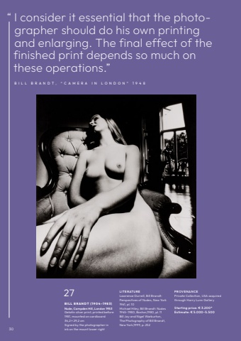 3027B I L L B R A N D T ( 1 9 0 4 %u2013 1 9 8 3 ) Nude, Campden Hill, London 1953Gelatin silver print, printed before 1981, mounted on cardboard34,2 %u00d7 29,2 cmSigned by the photographer in ink on the mount lower rightLITERATURELawrence Durrell, Bill Brandt: Perspectives of Nudes, New York 1961, pl. 10Michael Hiley, Bill Brandt: Nudes 1945%u20131980, Boston,1980, pl. 11Bill Jay and Nigel Warburton, The Photography of Bill Brandt, New York,1999, p. 252PROV E N AN C E Private Collection, USA acquired through Harry Lunn GalleryStarting price: %u20ac 3.200*Estimate: %u20ac 5.000%u20135.500%u201c I consider it essential that the photographer should do his own printingand enlarging. The final effect of the finished print depends so much on these operations.%u201dBILL BRANDT, %u201cCAMERA IN LONDON%u201d 1948
