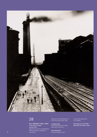 3128B I L L B R A N D T ( 1 9 0 4 %u2013 1 9 8 3 ) Catch Point, Halifax London 1936Gelatin silver print, printed before 1981, mounted on cardboard34 %u00d7 29,1cmSigned by the photographer in ink on the mount lower rightLITERATUREBill Brandt, Shadow of Light, New York 1977, pl. 40PROVENANCEPrivate Collection, USAacquired through Harry Lunn GalleryStarting price: %u20ac 2.800*Estimate: %u20ac 4.000%u20134.500