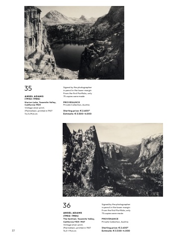 3736ANSEL ADAMS( 1 9 0 2 %u2013 1 9 8 4 ) The Sentinel, Yosemite Valley, California 1923%u20131927Vintage silver print, (Parmelian), printed in 192714,3 %u00d7 19,6 cmSigned by the photographer in pencil in the lower marginFrom the first Portfolio, only 75 copies were madePROV E N AN C E Private Collection, AustriaStarting price: %u20ac 2.600*Estimate: %u20ac 3.500%u20134.00035A N S E L A D A M S ( 1 9 0 2 %u2013 1 9 8 4 ) Marion Lake, Yosemite Valley, California 1923Vintage silver print, (Parmelian), printed in 192714,3 x19,6 cmSigned by the photographer in pencil in the lower marginFrom the first Portfolio, only 75 copies were madePROV E N AN C E Private Collection, AustriaStarting price: %u20ac 2.600*Estimate: %u20ac 3.500%u20134.000