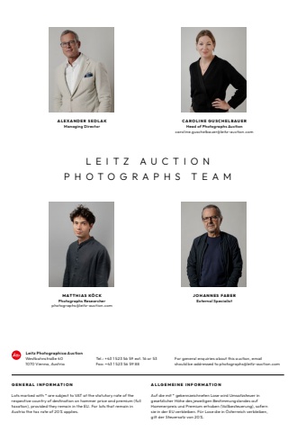 Lots marked with * are subject to VAT at the statutory rate of the respective country of destination on hammer price and premium (full taxation), provided they remain in the EU. For lots that remain in Austria the tax rate of 20 % applies.Auf die mit * gekennzeichneten Lose wird Umsatzsteuer ingesetzlicher H%u00f6he des jeweiligen Bestimmungslandes aufHammerpreis und Premium erhoben (Vollbesteuerung), sofernsie in der EU verbleiben. F%u00fcr Lose die in %u00d6sterreich verbleiben,gilt der Steuersatz von 20 %.JOHANNES FABERExternal SpecialistCAROLINE GUSCHELBAUERHead of Photographs Auctioncaroline.guschelbauer@leitz-auction.comMATTHIAS K%u00d6 CKPhotographs Researcherphotographs@leitz-auction.comALEXANDER SEDLAKManaging DirectorLEITZ AUCTIONPHOTOGRAPHS TEAMFor general enquiries about this auction, emailshould be addressed to photographs@leitz-auction.comLeitz Photographica AuctionWestbahnstra%u00dfe 401070 Vienna, AustriaTel.: +43 1 523 56 59 ext. 16 or 53Fax: +43 1 523 56 59 88GENERAL INFORMATION ALLGEMEINE INFORMATION