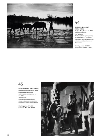 4544W E R N E R B I S C H O F ( 1 9 1 6 %u2013 1 9 5 4 ) Angkor Wat, Cambodia 1953Vintage silver print17,2 %u00d7 25,2 cmPhotographer%u2019s agency stamp on the reverse, %u201ca.b.c. press%u201d stamp and several handwritten notations in ink and pencil on the reverseStarting price: %u20ac 1.800Estimate: %u20ac 2.500%u20133.00045R O B E R T C A PA ( 1 9 1 3 %u2013 1 9 5 4 ) Pablo Picasso with Taurus mask in his studio, Paris 1949Gelatin silver print, printed inthe 1970s18,7 %u00d7 19,0 cmPhotographer%u2019s distribution stamp and various handwritten notations in pencil on the reverseStarting price: %u20ac 1.600Estimate: %u20ac 2.800%u20133.200