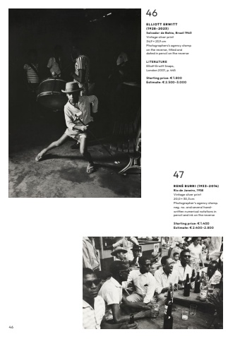 4647REN%u00c9 BURRI (1933%u20132014)Rio de Janeiro, 1958Vintage silver print20,0 %u00d7 30,3 cmPhotographer%u2019s agency stamp. neg. no. and several handwritten numerical notations in pencil and ink on the reverseStarting price: %u20ac 1.400Estimate: %u20ac 2.400%u20132.80046E L L I O T T E R W I T T ( 1 9 2 8 %u2013 2 0 2 3 ) Salvador de Bahia, Brazil 1963Vintage silver print34,9 %u00d7 23,9 cmPhotographers%u2019s agency stamp on the reverse, titled and dated in pencil on the reverseLITERATUREElliott Erwitt Snaps, London 2001, p. 445Starting price: %u20ac 1.800Estimate: %u20ac 2.500%u20133.000
