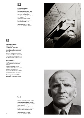 5152G Y%u00d6 R G Y K E P E S ( 1 9 0 6 %u2013 2 0 0 1 ) Untitled (Abstraction), 1938Gelatin silver print, printed in the 1970s, contact print, mounted on original cardboard11,8 %u00d7 9,4 cmSigned and dated by the photographer in pencil on the mount, Edition #10/25Starting price: %u20ac 1.800Estimate: %u20ac 2.500%u20133.00053F R I T Z K E M P E ( 1 9 0 9 %u2013 1 9 8 8 ) Albert Renger-Patzsch, c.1960Gelatin silver print, printed in 198144,8 %u00d7 36,8 cmSigned and dated by the photographer in pencil on the reverse, titled in pencil on the reverseStarting price: %u20ac 2.000Estimate: %u20ac 2.800%u20133.20051O T T O S T E I N E R T (1915%u20131978)Lichtspuren, Paris 1952Vintage silver print, mounted on original exhibition cardboard29,9 %u00d7 39,6 cmWith the photographer%u2019s early studio stamp %u201cFoto + Copyright / DR. STEINERT KEPLERSTR. 3 / SAARBR%u00dcCKEN%u201d on the reversePROV E N AN C E The print comes directly from Foto Cine Club Bandeirante (FCCB).The print was part of the exhibtion %u201cOtto Steinert and his students%u201d in Museum of Modern Art S%u00e3o Paulo in 1955 in collaboration with the FCCB.Starting price: %u20ac 7.000*Estimate: %u20ac 10.000%u201312.000
