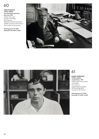 5860I N G E M O R AT H ( 1 9 2 3 %u2013 2 0 0 2 ) Saul Steinberg with Mask, New York 1959Gelatin silver print, printed in the 1980s25,2 %u00d7 35,2 cmSigned and titled by the photographer in pencil on the reverse, neg. number on the reverseStarting price: %u20ac 1.400Estimate: %u20ac 2.000%u20132.50061K A R I N S Z %u00c9 K E S S Y ( 1 9 3 8 %u2013 2 0 2 5 ) Joseph Beuys, 1961Gelatin silver print, printed in the 1980s19,4 %u00d7 28,4 cmSigned, titled and dated by the photographer in pencil on the reverseStarting price: %u20ac 1.200Estimate: %u20ac 1.800%u20132.200