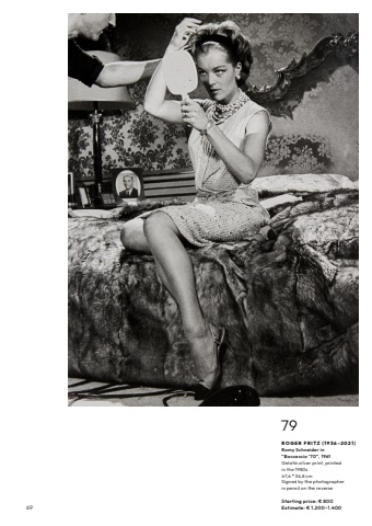 6979R O G E R F R I T Z ( 1 9 3 6 %u2013 2 0 2 1 ) Romy Schneider in%u201cBoccaccio %u201970%u201d, 1961Gelatin silver print, printed in the 1980s47,6 %u00d7 36,8 cmSigned by the photographer in pencil on the reverseStarting price: %u20ac 800Estimate: %u20ac 1.200%u20131.400