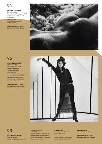 93H E L M U T N E W T O N ( 1 9 2 0 %u2013 2 0 0 4 ) Jenny in my studio, Paris 1978Vintage silver print46,1 %u00d7 30,1 cmSigned, titled and dated by the photographer in ink on the reverse, photographer%u2019s copyright stamp on the reverseL I T E RATU RE Helmut Newton, Portraits, Munich 1987, pl. 93Helmut Newton, Pola Woman, Munich 1992, p. 70 (variant)PROV E N AN C E In Focus Galerie, CologneStarting price: %u20ac 5.000*Estimate: %u20ac 8.000%u201310.00095K A R L L AG E R F E L D ( 1 9 3 3 %u2013 2 0 1 9 ) Helena Christensen for Chanel, Paris 1986Vintage silver print28,4 %u00d7 28,9 cmInititaled by the photographer in pencil on the reverse, titled and dated in pencil on the reverse, neg. no. 204165/6, Fashion for ChanelStarting price: %u20ac 1.800Estimate: %u20ac 2.500%u20133.00094L U C I E N C L E R G U E ( 1 9 3 4 %u2013 2 0 1 4 ) Nu de la Mer, Camargue c.1962Gelatin silver print, printed in the 1980s18,8 %u00d7 28,0 cmPhotographer%u2019s stamp on the reverseStarting price: %u20ac 1.200Estimate: %u20ac 1.800%u20132.000