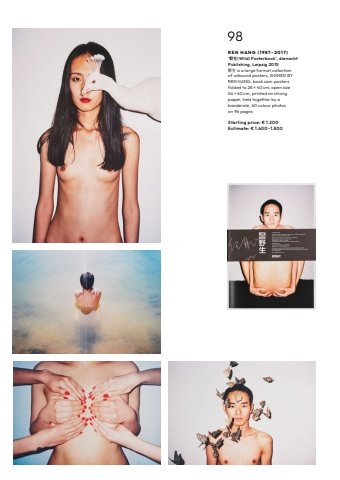 98R E N H A N G ( 1 9 8 7 %u2013 2 0 1 7 ) %u2018%u91ce%u751f(Wild) Posterbook%u2019, dienacht Publishing, Leipzig 2015%u91ce%u751f is a large format collection of unbound posters, SIGNED BYREN HANG, book size: posters folded to 28 %u00d7 40 cm, open size 56 %u00d7 40 cm, printed on strong paper, held together by a banderole, 60 colour photos on 96 pagesStarting price: %u20ac 1.200Estimate: %u20ac 1.600%u20131.800