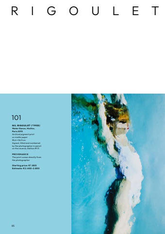 85101G I L R I G O U L E T ( * 1 9 5 5 ) Water Dance, Molitor, Paris 2015Archival pigment print on matte paper55,6 %u00d7 36,9 cmSigned, titled and numbered by the photographer in pencil on the reverse, Edition #1/3PROV E N AN C E The print comes directly from the photographerStarting price: %u20ac 1.800Estimate: %u20ac 2.400%u20132.800RIGOULET